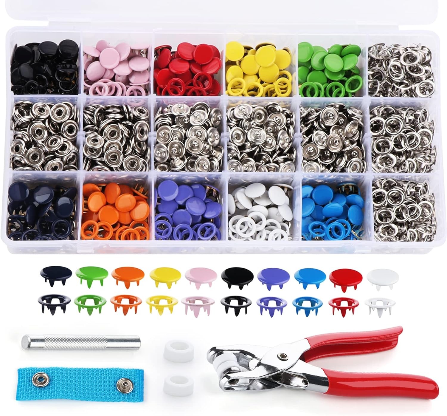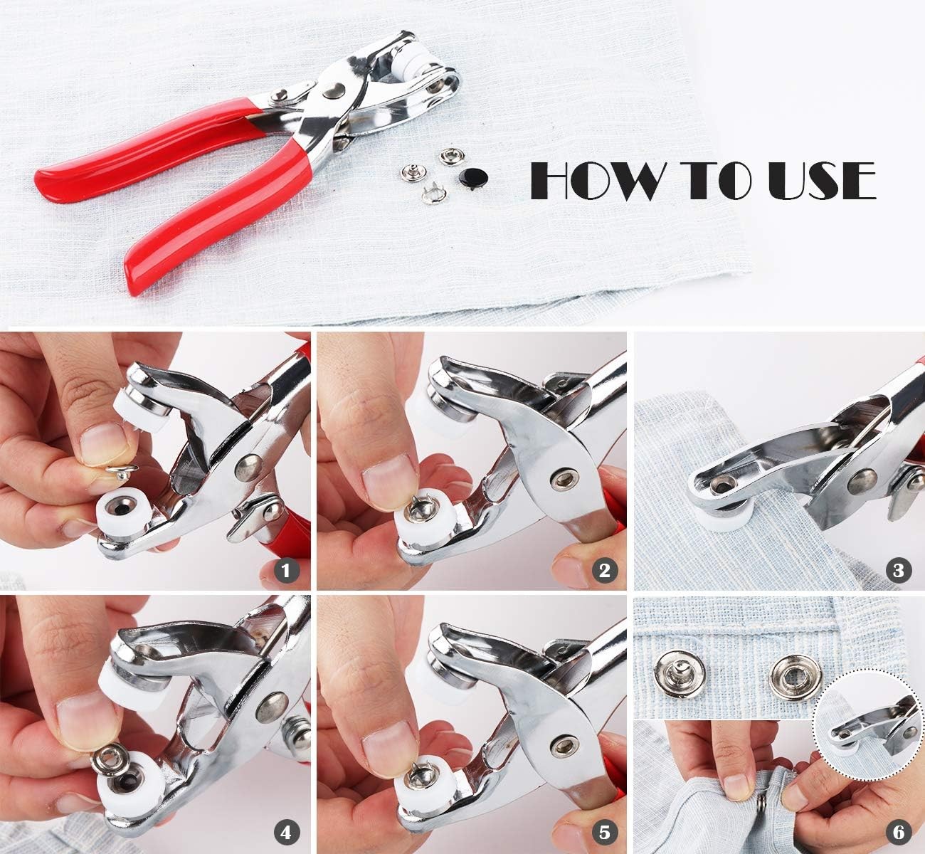 🧵 عملية بسيطة: لا تحتاج إلى مطرقة أو عمل ثقوب إضافية، يكفي استخدام كماشة الضغط اليدوية المرفقة لتثبيت الأزرار بسرعة وسهولة.